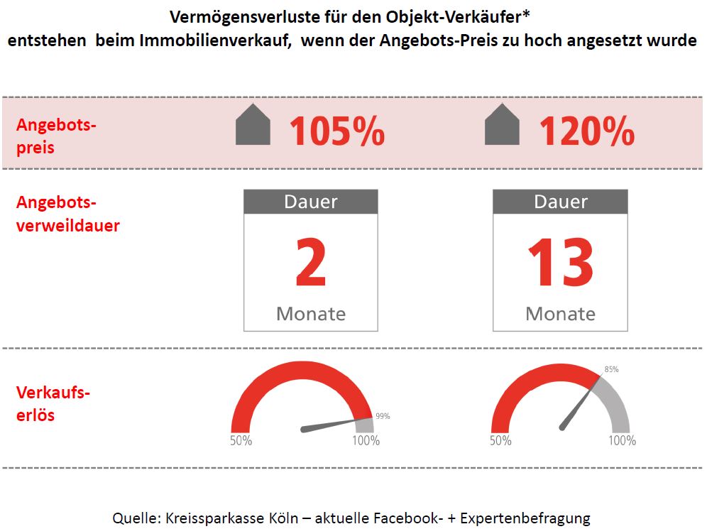 Nicht nur der letztendlich erzielte Verkaufspreis liegt weit unter dem Verkehrswert, sondern auch die Vermarktungsdauer ist deutlich länger, wenn Sie mit einem deutlich zu hohen Kaufpreis in der Vermarktung starten (hier 20% über dem Verkehrswert).