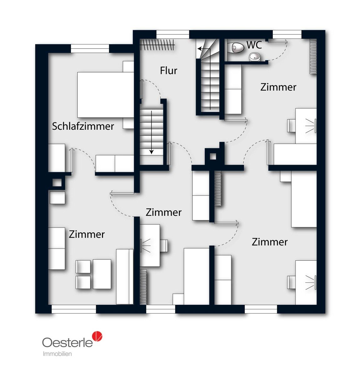 Im Obergeschoss stehen fünf Zimmer zur individuellen Nutzung zur Verfügung - ideal als Schlaf-, Kinder-, Arbeits- oder Gästezimmer. Die klare Raumaufteilung ermöglicht eine flexible Anpassung an unterschiedliche Lebensphasen.