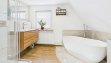 Schickes, modernes Badezimmer mit Dusche und frei stehender Badewanne