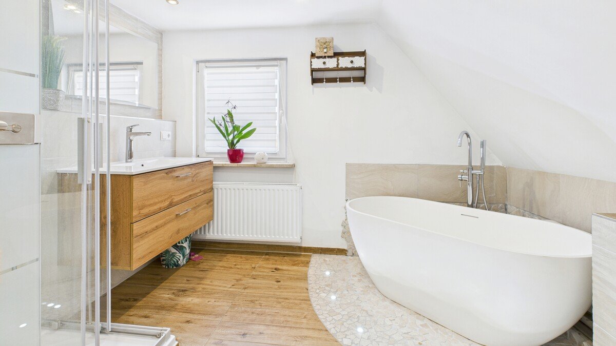 Schickes, modernes Badezimmer mit Dusche und frei stehender Badewanne