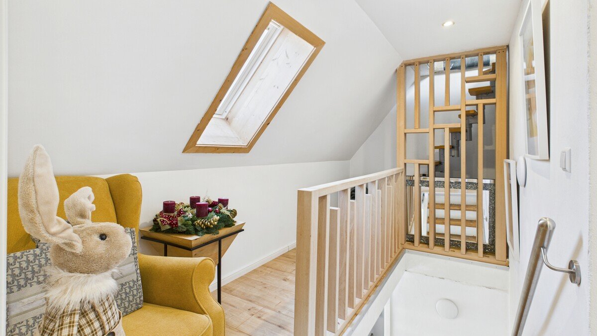 Der Dachspitz ist zugänglich und als Spiel- oder ggf Arbeitsbereich final ausbaubar; Versorgungsleitungen sind bereits vorgerichtet.