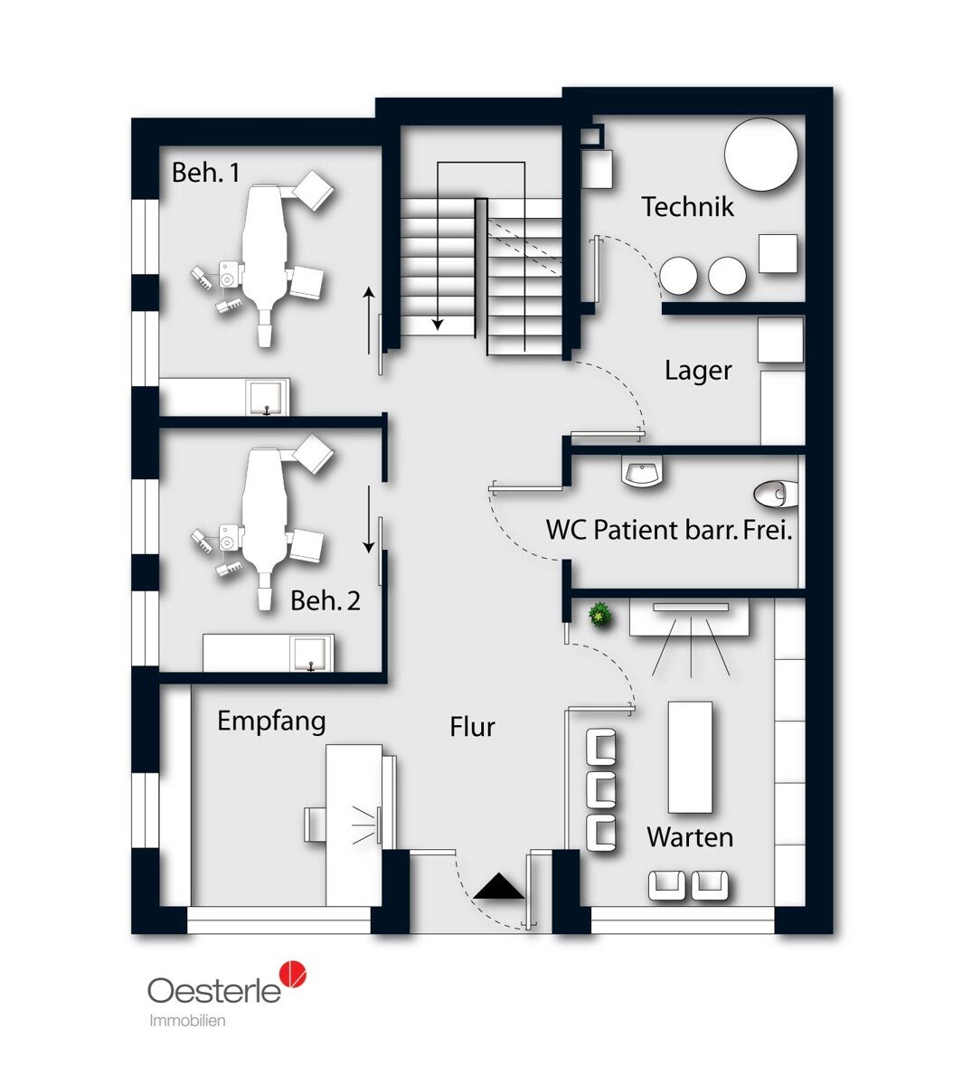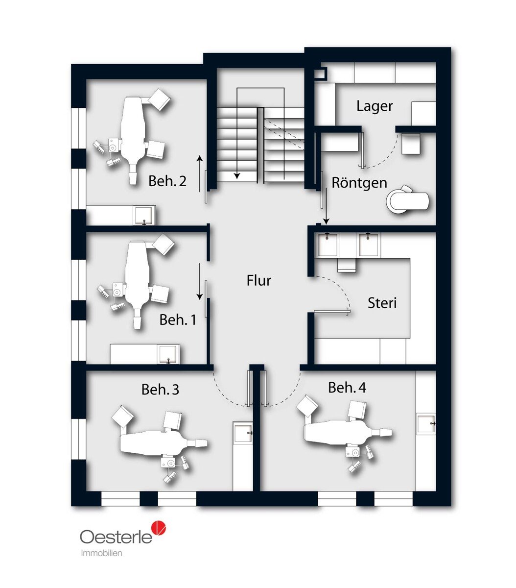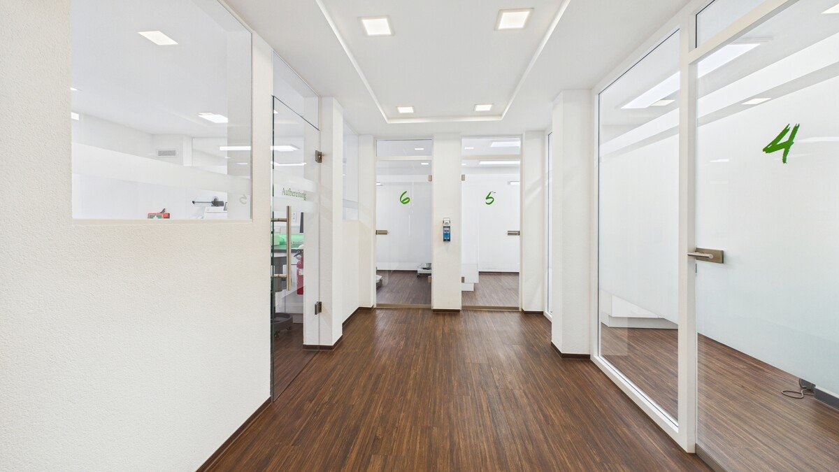 Die Räumlichkeiten präsentieren sich modern, freundlich und lichtdurchflutet und bieten viel Platz für einen strukturierten Praxisablauf. 6 Behandlungsräume, Funktions- und Nebenräume sowie ein im Obergeschoss eingerichtetes Dentallabor sorgen für effiziente Arbeitswege und eine klare Organisation.