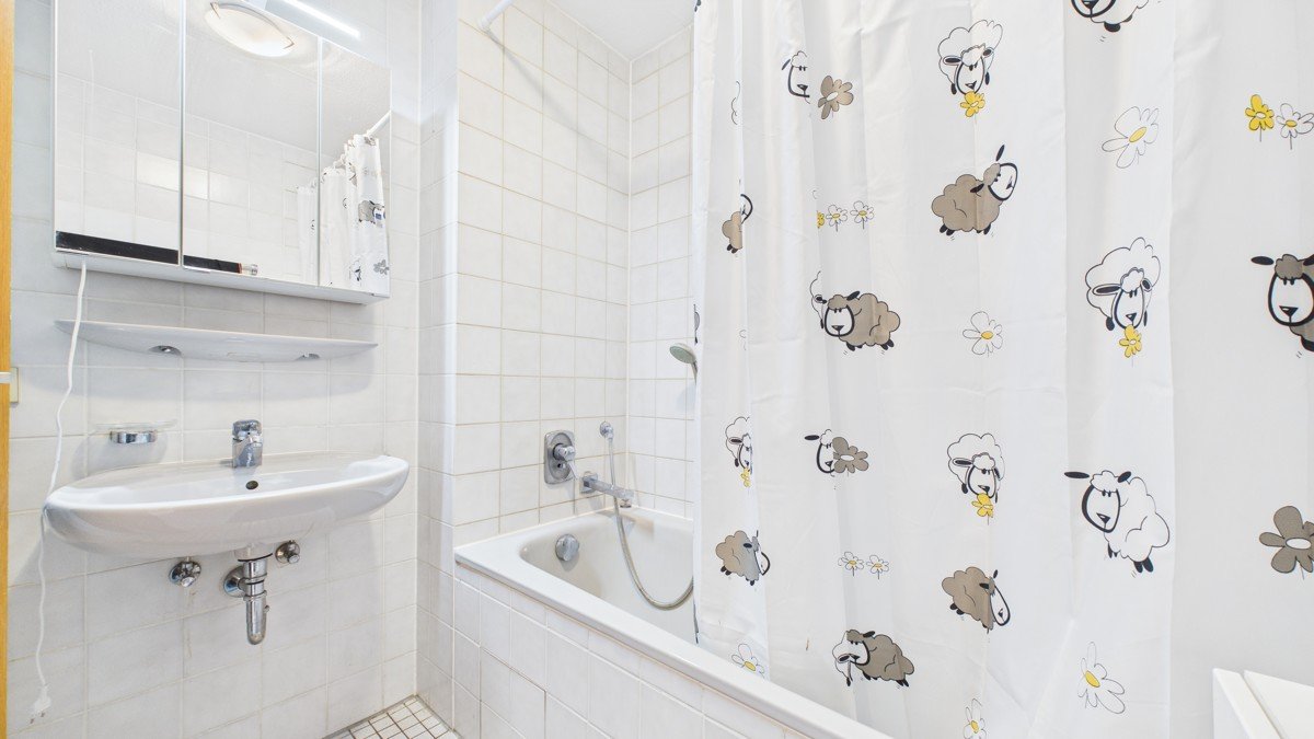 - Bad mit Badewanne und Waschtisch, raumhoch gefliest