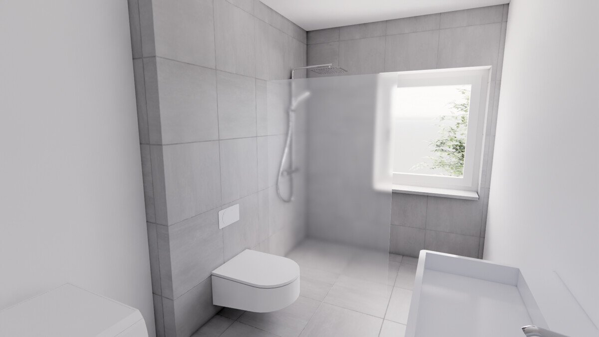 - Badezimmer: Modernes Bad mit ebenerdiger Dusche (barrierearm), Unterputz Regendusche, Mosaikfliesen, Waschmaschinenanschluss