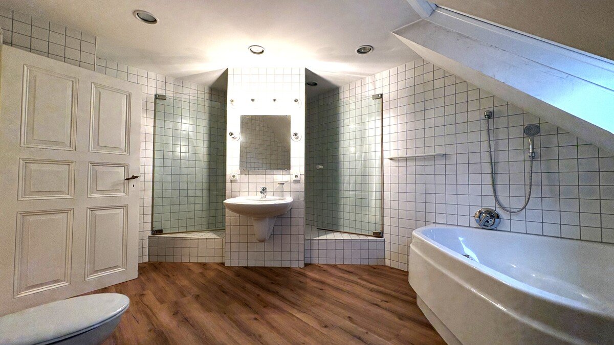 Die Böden sind überwiegend mit Parkett ausgestattet und sorgen für eine warme, hochwertige Wohnatmosphäre. Im Badezimmer wurde pflegeleichter Vinylboden in Parkettoptik verlegt. Das Tageslichtbad verfügt über eine Badewanne sowie eine separate Dusche, einen Waschtisch, ein WC und ein Bidet.